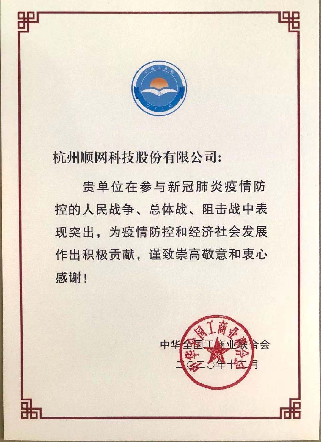 顺网科技因在疫情防控、积极调配捐献资源、履行社会责任和支持复工复产等方面所做的贡献而获得表彰,被全国工商联授予“抗击新冠肺炎疫情先进民营企业”荣誉称号。